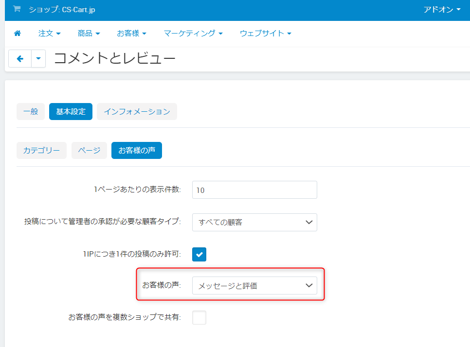この機能を有効化するには コメントとレビュー アドオンの基本設定にある お客様の声 タブ に移動し、”お客様の声” に “無効” 以外の値を指定してください。