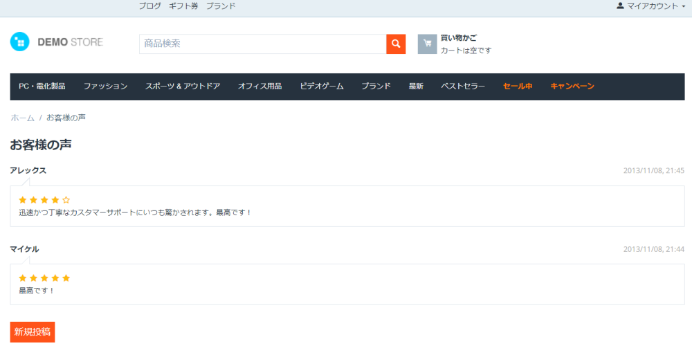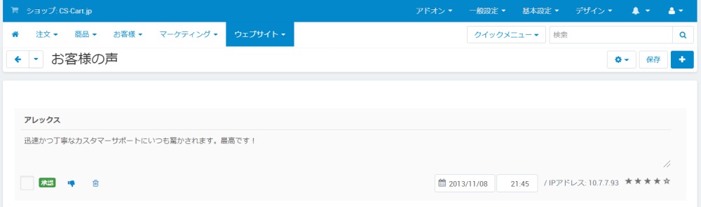 ウェブサイト → お客様の声 から投稿されたモールへの評価やコメントを管理できます。