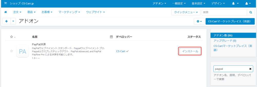 アドオン → アドオンの管理 を表示し、【Paypal決済】をインストールします。