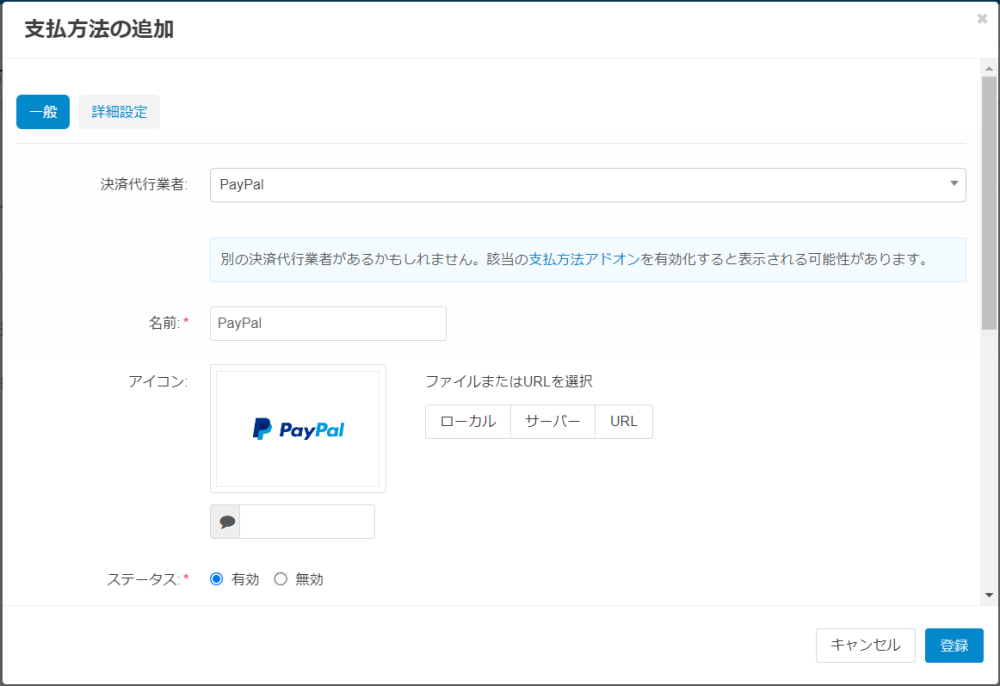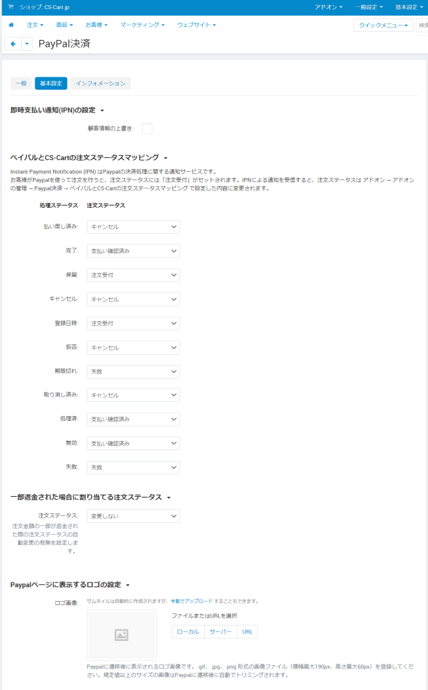 【Paypal決済】をクリックし基本設定タブを開き、ステータスやロゴの設定を行います。