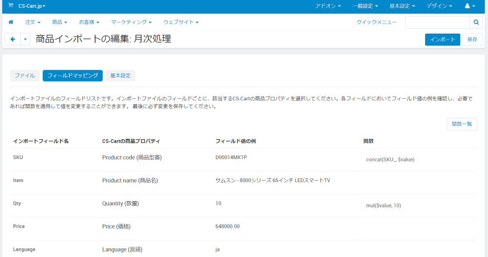 - インポートファイルのフィールドとCS-Cartモール版の商品プロパティをマッピングします。