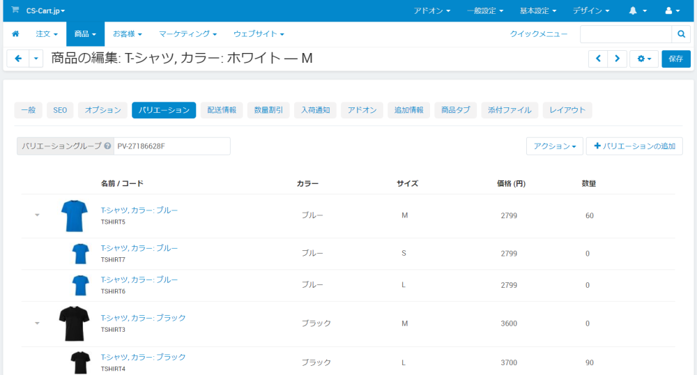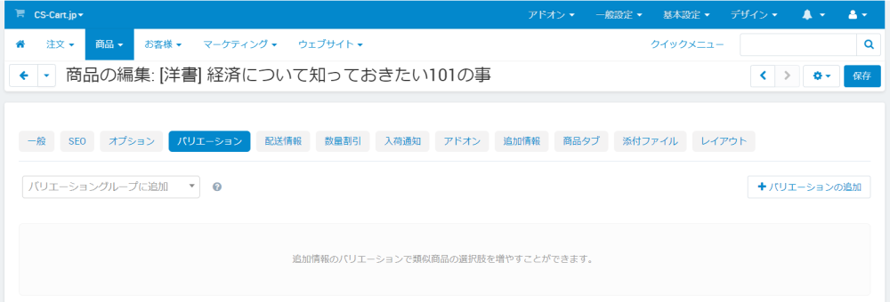- 「バリエーショングループ」フィールドより、グループコードを変更できます — グループコードは英数字および “-” と “_” のみが使用可能です。