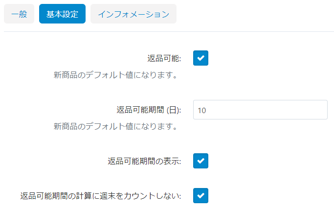| 返品可能期間の表示返品可能期間 (日) | 新商品のデフォルト値になります。 |