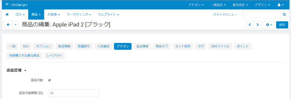 | 返品可能 | 商品の返品を受け付ける場合はチェックします。 |