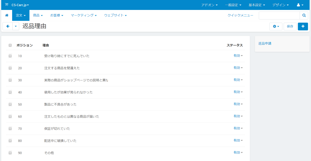 - 返品理由の管理( 画面右上の歯車アイコン → 返品理由 )