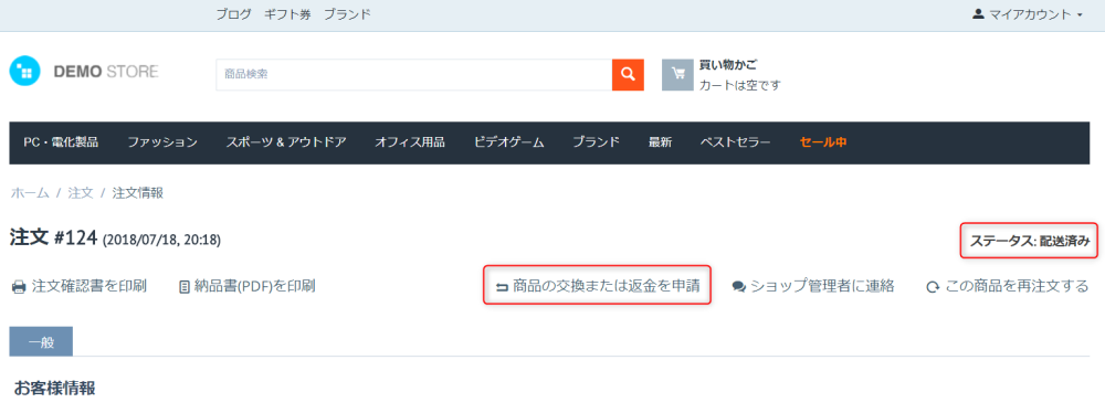 ステータスが「配送済み」となっている注文についてのみ、その下に「商品の交換または返金を申請」のリンクが表示されます。