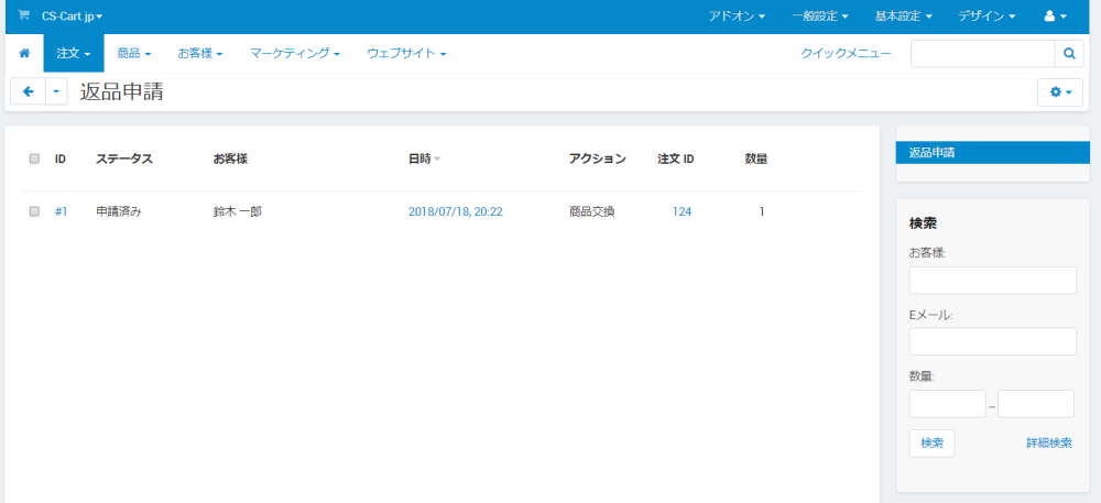 また、 注文 → 返品申請 にも該当する注文の返品情報が表示されます。